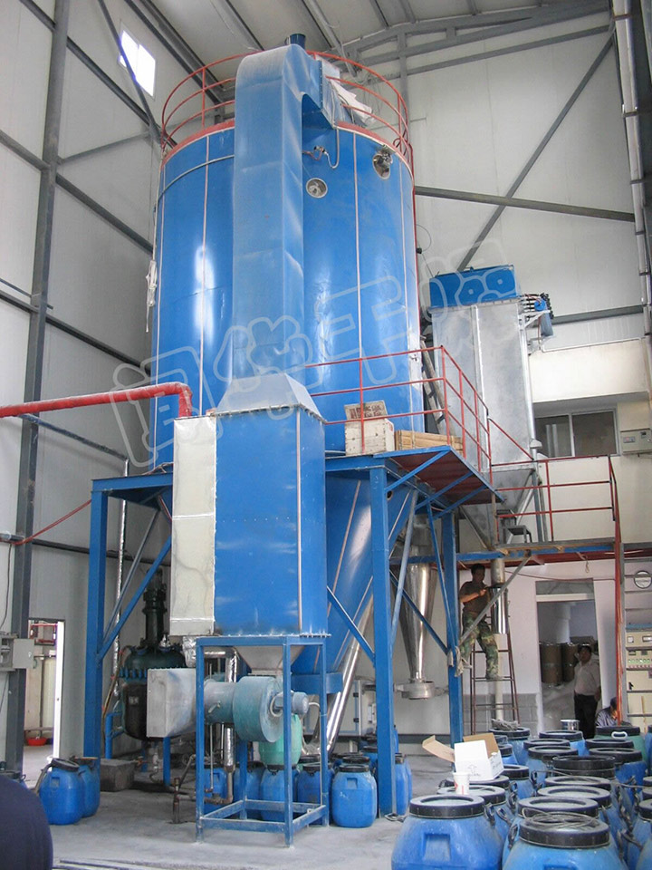 離心噴霧干燥機工作原理:空氣經過濾和加熱,進入干燥器頂部空氣分配器,熱空氣呈螺旋狀均勻地進入干燥室。料液經塔體頂部的高速離心霧化器,(旋轉)噴霧成細微的霧狀液珠,與熱空氣并流接觸在短時間內可干燥為成品。成品連續地由干燥塔底部和旋風分離器中輸出,廢氣由風機排空。